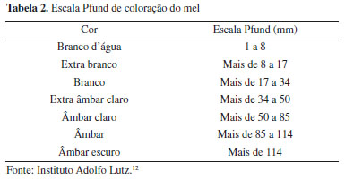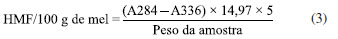 As amostras de pólen foram coletadas de potes diretamente na colônia, utilizando espátula e posteriormente, acondicionadas em potes hermeticamente fechados e transportadas para o laboratório da Universidade do Estado do Pará, onde ficaram armazenadas na temperatura de congelamento entre −12 °C a −15 °C , no período de 24 horas a 48 horas antes da análise. As análises foram realizadas no Laboratório de Alimentos localizado nas dependências da Universidade do Estado do Pará (UEPA). Caracterização físico-química do mel Umidade Determinada com auxílio de um refratômetro.10 Cinzas 2 g das amostras foram primeiramente carbonizadas lentamente, em seguida levadas à mufla, modelo 318M25T, marca QUIMIS, aquecida a 550 ºC. Após cinco horas de incineração, as amostras foram resfriadas em dessecador e pesadas.11 Sólidos insolúveis Pesou-se 20 g de mel que foram diluídos com uma mínima quantidade de água aquecida a 80 ºC. Filtrou-se a amostra em papel de filtro previamente seco em estufa a 105 ºC por 1 hora. Após este procedimento, o papel de filtro foi lavado com água destilada até ausência de açúcares, depois levado para estufa a 135 ºC durante 1 hora, para posterior pesagem, método por gravimetria.11 Acidez Determinada pelo método baseado em volumetria de neutralização. Pesou-se 5 g de amostra e adicionou-se 75 mL de água e 2 gotas de fenolftaleína. Titulou-se com hidróxido de sódio (NaOH) 0,01 N até aparecimento da coloração levemente rósea.12 pH Utilizou-se pHmetro, calibrado regularmente com soluções tampões pH 4,0 e 7,0.13 Açúcares redutores Foi preparada uma solução de mel (5 g de mel + 100 mL de H2O), posteriormente diluiu-se 10 mL desta solução para 100 mL de água. Titulou-se com uma solução contendo 5 mL de solução de Fehling A (34,639 g de sulfato de cobre pentahidratado + 1000 mL de H2O), 5 mL de solução de Fehling B (173 g tartarato duplo de sódio e potássio + 50 g de hidróxido de sódio + 1000 mL H2O), 40 mL de água, a titulação foi realizada na chapa aquecedora, iniciou-se a processo de titulação, quando a solução contendo Fehling A e B começou a ebulir.12 O teor de açúcar redutor foi calculado pela Equação (1): ![]() T: fator de correção da solução de Fehling; V: mL de amostra gasta na titulação; P: peso da amostra em gramas na solução. Açúcar total Pipetou-se 25 mL da solução de mel obtida na determinação de açúcares redutores para um balão volumétrico de 100 mL e adicionou-se 25 mL de água. Foi adicionado 1 mL de solução de ácido clorídrico e posteriormente aquecido a 65 ºC em banho-maria por 30 minutos. O frasco foi removido do banho e deixado em repouso para a solução resfriar naturalmente até a temperatura ambiente. Neutralizou-se com solução de hidróxido de sódio, usando papel indicador de pH. Completou-se o volume com água.12 Para o cálculo da sacarose foi utilizada a Equação (2): ![]() AT: açúcar total; AR: açúcar redutor. Hidroximetilfurfural Pesou-se 5 g da amostra e adicionou-se 25 mL de água e transferiu-se para balão volumétrico de 50 mL. Posteriormente foi adicionado 0,5 mL de solução de Carrez 1 (15 g K4Fe(CN)6.3H2O + 100 mL de H2O) e 0,5 mL de solução de Carrez 2 (30 g Zn(OAc)2.2H2O + 100 mL de H2O) e misturou-se. A amostra foi filtrada e os primeiros 10 mL descartados. Pipetou-se 5 mL do filtrado em dois tubos de ensaio. No primeiro tubo adicionou-se 5 mL de água e no segundo 5 mL de bissulfito de sódio (0,2%), como referência. Foi medida a absorbância da amostra, utilizando espectrofotômetro nos comprimentos de onda de 284 e 336 nm.10 Para o cálculo do hidroximetilfurfural (HMF), utilizou-se a seguinte Equação (3): ![]() Fator: 14,97 = (126/16,830) (1000/10) (100/5); onde: 126 = peso molecular do HMF; 16,830 = absortividade molecular do HMF a 284 nm; 1000 = mg g-1; 10 = centilitros L-1; 100 = porcentagem de HMF; 5 = peso teórico da amostra. Cor Por espectrofotômetro a 560 nm, em célula de 1 cm, usando-se como branco a glicerina pura. Os valores foram analisados com base na escala de Pfund.12