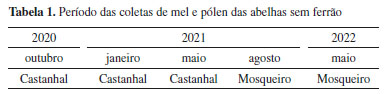 Departamento de Tecnologia de Alimentos, Universidade do Estado do Pará, 66095-100 Belém, PA - Brasil Recebido em 13/03/2023 *e-mail: elen.vanessa@uepa.br This study aimed to analyze the physicochemical characteristics of honey and pollen of two different species of stingless bees Melipona flavolineata and Melipona fasciculata from different regions in the State of Pará, the two totally different localities, Mosqueiro Island and Castanhal municipality, different climate and vegetation directly influence the quality and characteristics of these raw materials. The honey and pollen samples were collected and stored in hermetically sealed pots, the honey was kept at room temperature and the pollen at a freezing temperature of −12 °C to −15 °C, the analyzes were carried out in the laboratory of the Universidade do Estado do Pará - Campus Castanhal. For physicochemical characterization of honey, moisture, acidity, pH, ash, insoluble solids, HMF reducing sugar, total and apparent sucrose, HMF and color were performed. For the physicochemical characterization of the pollen, moisture, ash, protein, acidity, reducing and total sugars were analyzed. Regarding the honey collected in the meliponario of the municipality of Castanhal, they obtained different results from the honey collected in Mosqueiro, even being of the same species. In the pollen collected from the stingless bees of the meliponario located on the island of Mosqueiro, there were high levels of lipids, the results of proteins obtained from the pollen of Castanhal were high, unlike the pollen of the island of Mosqueiro. INTRODUÇÃO A diversidade de flora e biomas do Brasil e a grande variedade de espécies de abelhas sem ferrão existente conferem um enorme potencial para produção e valorização de méis produzidos por essas abelhas. Além da importância econômica para os produtores, esse produto possui características sensoriais diferenciadas dos méis tradicionalmente consumidos no Brasil, tornando-o um produto com alto valor agregado.1 As abelhas sem ferrão possuem como principal produto o mel e o pólen. O mel é considerado um fluido viscoso, aromático e doce elaborado por abelhas a partir do néctar e/ou exsudatos sacarínicos de plantas, principalmente de origens florais, os quais, depois são colocados em potes para sua alimentação. É um produto que tem apresentado uma demanda crescente de mercado, entretanto estudos sobre as características físico-químicas que auxiliem na definição de padrões de qualidade para sua comercialização ainda são escassos na região. Portanto, é de fundamental importância a caracterização de méis principalmente nas regiões tropicais, onde a flora apícola é bastante diversificada, associada às taxas elevadas de umidade e temperatura.2 O tipo de pólen mais estudado no mundo é aquele coletado pela espécie Apis mellifera, e pouco é conhecido sobre a composição química do pólen coletado pelas abelhas sem ferrão. Nesse sentido, saber seus componentes é importante para caracterizar os produtos obtidos de diferentes regiões, climas, e espécies de abelhas, para ter um melhor controle de qualidade, e incentivar a criação de abelhas sem ferrão para extração comercial de seus produtos.3 O trabalho objetivou analisar as características físico-químicas do mel e pólen das abelhas sem ferrão M. flavolineata e M. fasciculata de diferentes lugares e épocas do ano, em um meliponário situado em Castanhal e de um meliponário situado na ilha de Mosqueiro. Meliponicultura vs. apicultura A produtividade de mel das abelhas sem ferrão é inferior a das abelhas africanizadas, porém, obtém melhor preço no mercado por possuir características únicas e diferenciadas como aroma, sabor e por se tratar de um produto especial, orgânico e raro. Cerca de 70 espécies de meliponídeos poderiam ser criadas para uso em polinização ou para produção de mel, que por não terem ferrão, têm a vantagem de serem manuseadas por crianças e pessoas alérgicas ao veneno da Apis mellifera e ainda sem o uso de roupas especiais, diminuindo seu custo. Por essas características, a meliponicultura pode ser utilizada como ferramenta de conservação e restauração de áreas naturais. É uma prática econômica que permite a convivência de pessoas e unidades de conservação, por exemplo, o que colabora para a construção de um novo modelo de desenvolvimento compatível com a proteção da biodiversidade.4 O mel das abelhas sem ferrão pode deteriorar-se mais rapidamente que o mel Apis mellifera devido ao seu menor nível de doçura e maior teor de umidade. Esses são critérios-chave para fatores como: a determinação dos melhores processos em termos de conservação e armazenamento; a prevenção da fermentação ou cristalização; e o controle de aumentos de atividade de água para valores em que certos fungos filamentosos como Penicillium e Mucor poderiam crescer em sua superfície.5 Este mel requer maiores níveis de cuidado durante a colheita e precisa ser refrigerado, pasteurizado ou submetido a desumidificação para garantir sua durabilidade. Se for refrigerado ao longo do tempo, a cristalização pode ocorrer. Os processos de pasteurização e desumidificação reduzem o teor de água, mas podem ser responsáveis pela perda de aromas e sabores no mel.6 Abelhas indígenas sem ferrão ocorrem praticamente em todos os tipos de habitats, possuindo muitas espécies com hábitos de nidificação variados e consequentemente com grande variabilidade na sua biologia. Essa diversidade permite que a meliponicultura seja desenvolvida em diversos biomas com as respectivas abelhas locais. Porém, na Amazônia, por exemplo, existem centenas de espécies diferentes de meliponídeos, mas nem todas produzem mel em quantidade suficiente que compense sua criação com o propósito de geração de renda para seus criadores.4 Comparada a outras atividades agropecuárias, a apicultura ne