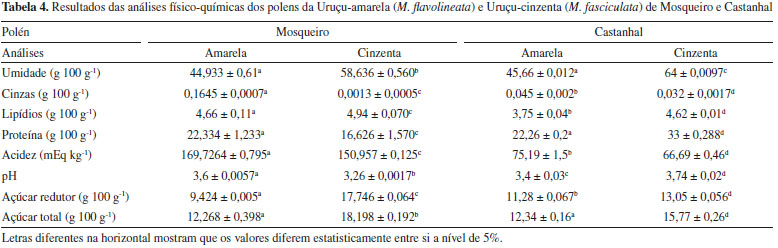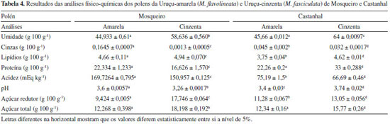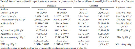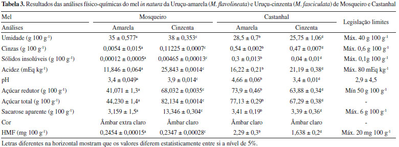 RESULTADOS E DISCUSSÃO Na Tabela 3 encontram-se os resultados das análises físico-químicas dos méis da Uruçu-amarela (M. flavolineata) e Uruçu-cinzenta (M. fasciculata) de Mosqueiro e Castanhal.