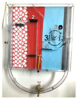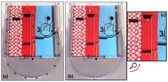 ![]() Figura 2. Imagem da vista superior do tabuleiro elaborado, indicando seus principais componentes de acordo com a descrição no texto