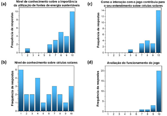 ![]() Figura 4. Gráficos de barras referente as respostas do questionário sobre o (a) nível de conhecimento sobre a importância da utilização de fontes de energia sustentáveis, (b) nível de conhecimento sobre células solares, (c) como a interação com o jogo contribuiu para o entendimento sobre células solares e (d) avaliação do funcionamento do jogo
