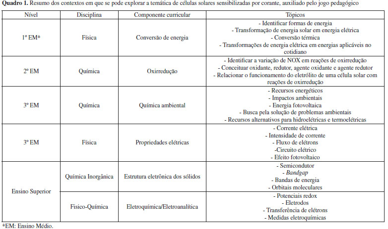 | Elaboração de um método lúdico para o ensino de química: um jogo baseado em células solares sensibilizadas por corante Elaboration of a playful method for chemistry teaching: a game based on dye-sensitized solar cells |