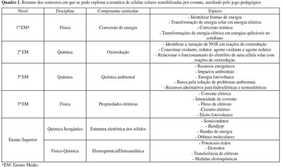 Os níveis de energia são retratados pelas barras de madeira preta, como indicadas pela ampliação na Figura 3c. Nela, os níveis 7 e 8 correspondem, respectivamente, aos orbitais HOMO (highest occupied molecular orbital - orbital molecular ocupado de maior energia) e LUMO (lowest unoccupied molecular orbital - orbital molecular não ocupado de menor energia) do corante, respectivamente, enquanto o 9 equivale a banda de condução (BC) do semicondutor (TiO2). Já o nível 10 simboliza o potencial de oxirredução do eletrólito. A diferença energética entre esses níveis de energia garante a espontaneidade na transferência de elétron, assim como o caráter cíclico de funcionamento de uma CSSC. A trajetória do elétron (representado pela esfera metálica) ao longo do processo de conversão de energia em uma CSSC pode ser visualizada pela linha pontilhada na Figura 3a. O circuito se inicia pela excitação eletrônica do corante, representada pela projeção do elétron por meio do gatilho. Devido à baixa diferença entre o estado excitado do corante e a BC do TiO2, a esfera de metal é direcionada para o semicondutor e, subsequentemente, percorre o circuito externo até o contraeletrodo. Ao adentrar no eletrólito, o elétron integra-se ao íon I3- que reduz a 3I-, o qual se oxida novamente para regenerar o corante. Espera-se que esta trajetória ocorra de forma direta, para melhor representar uma célula real, no entanto, caso a execução seja falha, o que depende da força com a qual o usuário puxa e solta o gatilho, o ciclo pode ser completado manualmente, com um imã de neodímio para guiar a esfera metálica pelo circuito externo até a entrada pelo lado oposto, para atingir a região azul. Apesar de parecer uma limitação do jogo, esta etapa está relacionada com a força inicial do usuário no momento do lance da esfera metálica. O tabuleiro desenvolvido possibilita a visualização de como ocorre o processo de conversão de energia realizado por uma célula solar sensibilizada por corante, etapa por etapa. A dinamicidade física do jogo facilita o entendimento do funcionamento teórico desse tipo de célula solar, pois a observação do percurso do elétron torna claro esse fenômeno. Assim, nota-se a viabilidade da aplicação deste jogo como uma metodologia de ensino, sendo o maior diferencial didático deste, pautado na contextualização e ludicidade, aliadas a inclusão de tecnologias emergentes que permitem discussões interdisciplinares. Trazendo para um contexto de Ensino Médio, a implementação desse jogo permite abordar variados tópicos da química, num contexto interdisciplinar, sobretudo envolvendo conceitos de eletroquímica, com ênfase em reações de oxirredução, fluxo de elétrons, propriedades dos materiais, conversão de energia, bem como questões ambientais relacionadas. O Quadro 1 apresenta um resumo com possibilidades dos contextos em que a aplicação do jogo, juntamente a temática, podem ser inseridos. A partir de uma análise da Base Nacional Curricular Comum (2017), encontra-se na área de "Ciências da Natureza e suas Tecnologias" alguns pontos que podem englobar o ensino acerca das CSSC, destacando-se as competências específicas 1 (habilidades EM13CNT101, EM13CNT102 e EM13CNT106) e 3 (habilidade EM13CNT309).40 Já para discentes de nível superior, além da própria temática de conversão de energia, o jogo pode ser aproveitado para a abordagem das propriedades elétricas dos materiais, como características de semicondutores, processo de condução eletrônica em sólidos e medidas eletroquímicas, além de posicionamento de bandas de energia e orbitais moleculares, quando corantes são usados.