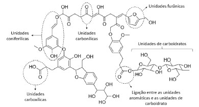 ![]() Figura 1. Representação esquemática da estrutura química para substância húmica pirolítica proposta por Stankovikj et al.38