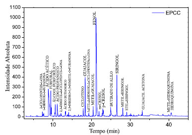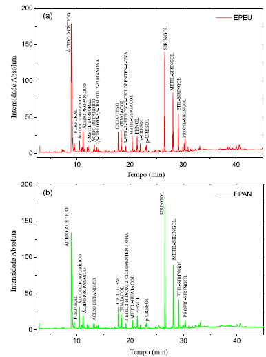 ![]() Figura 3. Cromatogramas com a identificação dos principais picos da amostra de EP: (a) de eucalipto produzido no forno de alvenaria (EPEU), (b) de acácia negra produzido no forno de alvenaria (EPAN)