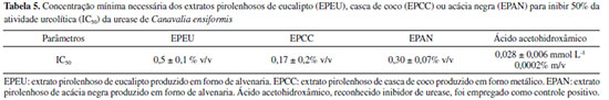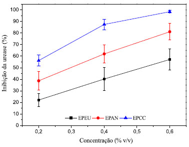 ![]() Figura 4. Curva concentração dos extratos pirolenhosos versus efeito inibitório in vitro da atividade anti-ureolítica da urease de Canavalia ensiforms