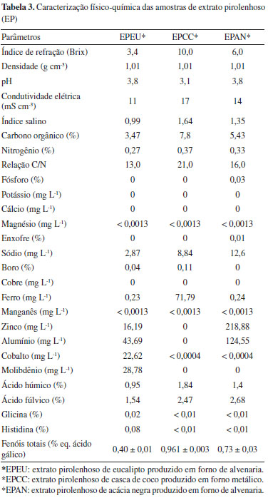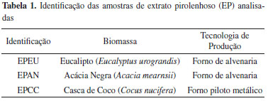 PARTE EXPERIMENTAL Foram analisadas três amostras comerciais de 1 L de extrato pirolenhoso (EP) fornecidas pela empresa EPB Extrato Pirolenhoso do Brasil. As amostras se diferenciam pela biomassa (casca de coco, acácia negra e eucalipto) e pelo tipo de forno utilizado no processo produtivo (forno metálico ou de alvenaria) (Tabela 1). O extrato pirolenhoso foi obtido pela condensação de uma fração dos gases gerados na carbonização dessas biomassas, entre as temperaturas de 80 e 150 °C, conforme orientações técnicas da Embrapa.18