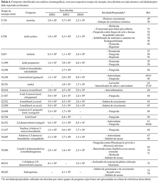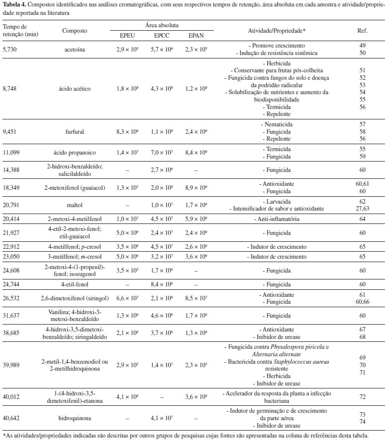 Conforme reportado por Theapparat et al.,48 em todas as amostras foram identificados compostos com diversas classes orgânicas (fenóis, ácidos carboxílicos, cetonas, ésteres, éteres etc.), sendo os ácidos e os fenóis os principais grupos identificados utilizando-se a metodologia aplicada no presente trabalho. A variedade de compostos presentes no EP, confere a ele diversas funcionalidades para uso na agricultura, conforme destacado na Tabela 4.
