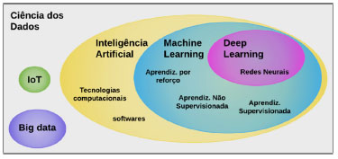 Apesar da IA ter nascido em 1956, seu entendimento pode ser identificado na questão proposta pelo matemático britânico Alan Turing, em sua publicação (1950): As Máquinas Podem Pensar? Nessa publicação, foi apresentada a capacidade de aprendizagem das máquinas por imitação e a possibilidade de atuação destas em campos puramente intelectuais. Hoje, a IA ultrapassou as suas propostas iniciais e, inclusive, já pode ser dividida em dois níveis: machine learning e deep learning. Machine learning foi traduzido para o português como "aprendizado de máquinas", enquanto no espanhol e no francês a tradução seria "aprendizagem automática", ou autoaprendizado, pois, neste nível, a IA reconhece padrões, aprendendo com esses dados e propondo resultados como saída, um exemplo seria os sistemas de busca e de filtros em sites e e-mails. Neste sistema, as máquinas podem aprender (i) com a intervenção humana, que organiza os dados na máquina e essa, posteriormente, reconhece esses dados, como a identificação prévia de um gato em um foto faz com que em uma nova foto, por exemplo, a IA reconheça aquele padrão de imagem e assim a classifique na categoria gato - "aprendizagem supervisionada"; ou (ii) sem a intervenção humana, a máquina reconhece padrões, como exemplo a imagem do gato, e as agrupa em categorias - "aprendizagem não supervisionada".23,25 Existe ainda um terceiro modo de aprendizagem, (iii) em que as máquinas aprendem pela experiência, quando suas operações estão corretas, ela tem o reforço positivo, como ocorre no adestramento de cães, que quando um comando está correto ele ganha uma recompensa - "aprendizagem por reforço".23 O segundo nível é derivado do primeiro, a deep learning é conhecida como "aprendizagem profunda" e estão cada vez mais crescentes as produções neste nível, pois esse modo, também chamado de "redes neurais", utiliza um sistema que simula o processo das sinapses entre os neurônios, criando uma arquitetura com as conexões, partindo de x entradas (input) e resultando em y saídas (output), ou até em uma única. Assim, a deep learning consegue produzir respostas sem a intervenção humana, como o reconhecimento de voz, a identificação de veículos, a visão artificial e os programas de assistência remota. Tal tecnologia requer um volumoso conjunto de dados e uma potente capacidade de processamento, o que vem ao encontro de outros avanços na área da computação, como a "internet das coisas" (internet of things - IoT)26 e o big data,27 pois a internet tem conectado todos os aparelhos, ditos inteligentes, que capturam dados e que através do big data, processa esse grande volume de dados para que a IA transforme em informações que tenham uma utilidade, ou que sejam a resposta a que se pretende. Segundo Rouhiainen, o Facebook já realiza 4,5 bilhões de traduções diárias, "sem a deep learning, seria muito custoso e iria requerer uma grande equipe de pessoas para oferecer o mesmo serviço".23 A Figura 2 mostra a estruturação de tais tecnologias compondo a ciência dos dados.