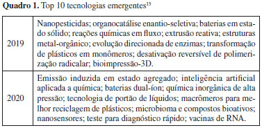 ALVORECER DA INDÚSTRIA 4.0: A QUÍMICA IN SILICO Em 2019, a IUPAC (União Internacional de Química Pura e Aplicada), em comemoração ao seu 100º ano de fundação, apresentou as "Top 10 Tecnologias Emergentes na Química", entendendo como "tecnologias emergentes" aquelas que estão entre as novas invenções científicas e as totalmente comercializáveis, entre o que é desenvolvido em laboratório e o que é possível de aplicar industrialmente, bem como o que apresentava maior capacidade de ampliar a atuação da Química, isto é, " envolver um conhecimento sólido da tecnologia, algum tipo de protótipo ou, melhor ainda, algumas start-ups trabalhando para comercializar a tecnologia".13 A proposta foi uma iniciativa do professor Javier Garcia-Martinez, da Universidade de Alicante (Espanha) e membro do Conselho da IUPAC. Dessarte, Fernando Gomollón-Bel apresentou um detalhamento de tais tecnologias, destacando como elas, por intermédio da química, possuem potencial para mudar o mundo.14 Em 2020, a proposta foi "mostrar o valor da química e informar o público em geral sobre como as ciências químicas contribuem para o bem-estar da sociedade e a sustentabilidade do Planeta Terra".15 Abaixo, são apresentadas as "Top 10 Tecnologias Emergentes na Química" eleitas em 2019, a primeira seleção da IUPAC, e as finalistas para 2020 (Quadro 1), na qual uma delas chama nossa atenção: "Aplicação da Inteligência Artificial na Química".