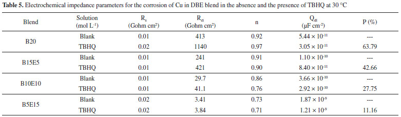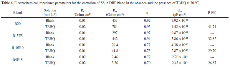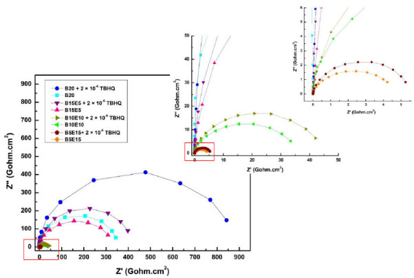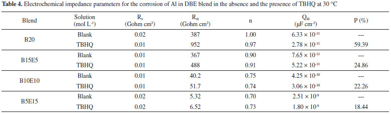 EIS measurements EIS is a non-destructive method used to study the electrochemical system and to predict the corrosion rate of metals. It was used to investigate the corrosion inhibition efficiency of TBHQ toward Al, Cu and 304 SS in four different DBE blend proportions. Figures 2, 3 and 4 show the Nyquist impedance plots for Al, Cu and 304 SS in B20, B15E5, B10E10 and B5E15, respectively, in the absence and presence of optimum concentrations of TBHQ at 30 °C.18