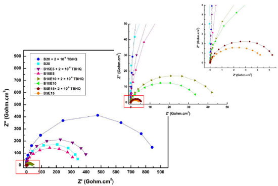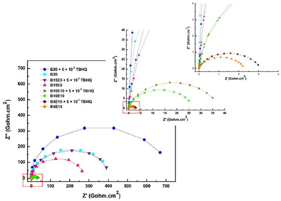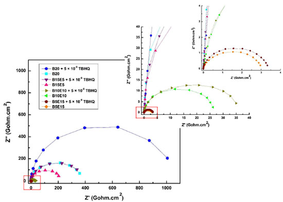 ![]() Figure 4. Nyquist impedance plots for 304 stainless steel in different proportions of DBE blends in the absence and the presence of TBHQ at 30 °C