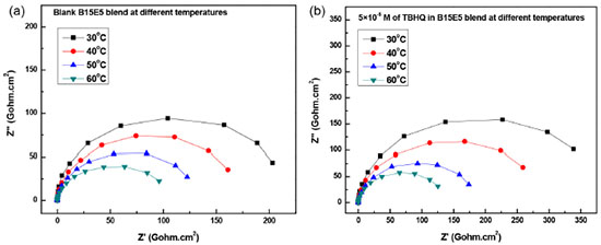 ![]() Figure 6. Nyquist impedance plots for Cu in B15E5 blend in (a) the absence and (b) the presence of 5 × 10-5 mol dm-3 of TBHQ at different temperatures
