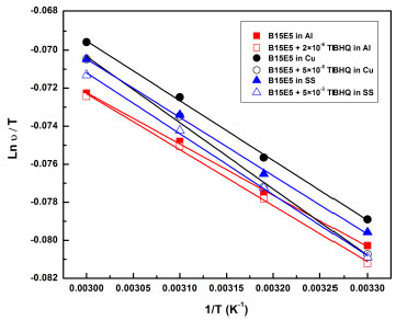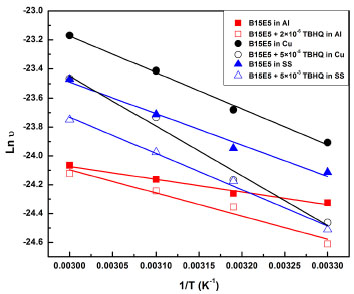 ![]() Figure 8. Variation of Ln (υ/T) with 1/T of Al, Cu and 304 SS in B15E5 in the absence and the presence of TBHQ