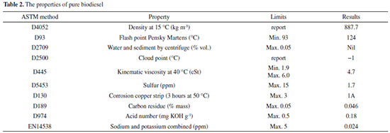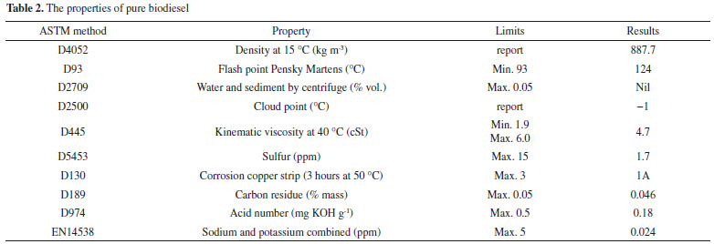 EXPERIMENTAL PART Materials and methods The biodiesel was prepared in the laboratory by transesterification of corn oil (acquired from a local store) with methanol (acquired from Sigma Aldrich), in the presence of NaOH as a catalyst. The reaction was done at 60 °C for 1 h, and biodiesel (product) and glycerol (byproduct) were separated in a separating funnel. The biodiesel was then washed with distilled water to remove all impurities. The properties of biodiesel are shown in Table 2 and these values were acceptable considering ASTM D6751-20a. Diesel, biodiesel and ethanol 99.7% (acquired from Sigma Aldrich) were mixed by volume in different proportions. The four different fuel blends, namely, B20 (80% diesel and 20% biodiesel), B15E5 (80% diesel, 15% biodiesel and 5% ethanol), B10E10 (80% diesel, 10% biodiesel and 10% ethanol) and B5E15 (80% diesel, 5% biodiesel and 15% ethanol) were prepared 30 minutes before the experiment (to prevent reaction of blend with oxygen atmosphere) and kept in sealed glass bottles. The properties of the pure biofuel and the various blends were determined according to American Society for Testing and Materials (ASTM) standards. The working electrodes used were aluminum (Al), copper (Cu) and stainless steel (SS). The surface of the exposed area of each electrode was 9.15 cm2. The chemical composition of all working electrodes was determined using Spectromax arc/spark OES metal analyzer present in TQP Laboratories, Lebanon, and is presented in Table 1. Each electrode was abraded before use with grading papers (grades 150, 350, 600 and 800) to remove the scratches produced during cutting and grinding, and thereafter washed with distilled water, rinsed with acetone and dried before the immersion in the blend.