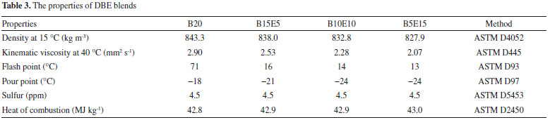 RESULTS AND DISCUSSION Fuel properties The properties of biodiesel blends are very important for the efficient work of engines; the studies have shown that the addition of biodiesel can increase the density and viscosity of diesel, and change its cold weather properties, which can lead to undesirable consequences. However, the addition of ethanol can compensate for the slight change in the fuel properties. Density is one of the most important characteristics of fuel, where a high density can cause a change in engine output power due to the change in mass injected fuel since the fuel injection meter in the engine measure fuel by volume.9,19 As shown in Table 3, the density decreased upon addition of ethanol for a maximum of 1.83%. Another important parameter to assess in fuel quality is viscosity. High viscosity can cause poor fuel atomization, higher engine deposits and incomplete combustion.20 In the current study, viscosity decreases by the addition of ethanol to a maximum of 28.62%. The cold flow properties such pour point can depict the cold flow operability of the fuel especially in cold weather.9 A decrease of 25% was observed in pour point. On the other hand, a slight increase (0.47%) was detected in the heat of combustion. Moreover, the sulfur content did not change suggesting that neither the biodiesel nor ethanol contain residual sulfur, leading to less harmful emission from tshe blends in comparison with conventional diesel. Nevertheless, there was a significant decrease of the flash point to below the ambient temperature, which is dominated by the flash point of the ethanol, this decrease makes the blends highly flammable which will lead to a change in the storage classification of the fuel and more precaution in the handling and transportations of the blends.19