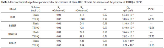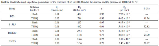 It can be observed that the impedance plots for all metals in the different DBE blends consisted of characteristic depressed semicircle of capacitive type indicating that the dissolution process occurs under activation control. The deviation from a typical semicircle is attributed to inhomogeneity and roughness of the metal surface.21,22 The presence of only one depressed semicircle suggests a single charge transfer process. Addition of TBHQ enlarged the diameter of the semicircle of the Nyquist plots without affecting the plot shape.18 This suggests that the inhibitive action of TBHQ is due to the adsorption of TBHQ molecules on the metal surfaces (Al, Cu and SS) without variation in the corrosion mechanism.23 While the size of the obtained semicircle increased upon addition of TBHQ, a significant decrease was observed with the increase of ethanol percentage in the blend for the three studied metals. The impedance data of Al, Cu and SS in DBE blends are analyzed in terms of equivalent circuit model presented in Figure 5. It comprises a solution resistance (Rs), charge transfer resistance (Rct) and constant phase element (CPE).24 The CPE (Qdl,n) is composed of non-ideal double layer capacitance Qdl and a coefficient "n" that quantifies different physical phenomena like surface inhomogeneity, inhibitor adsorption and porous layer formation. The values of EIS parameters obtained from the fitting of the experimental Al, Cu and SS data to the corresponding equivalent circuit are indicated in Tables 4, 5 and 6, respectively.
