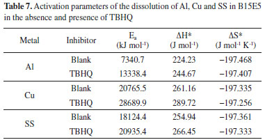 CONCLUSION Different metals (Al, Cu, and SS) have shown variation in corrosion rates with increasing ethanol concentration in the blends. The addition of ethanol was found to increase the rate of corrosion for all metals. TBHQ was an effective corrosion inhibitor and showed good performance on Al, Cu and SS in the four different proportions of DBE blends as suggested by the electrochemical impedance measurements. Nevertheless, the inhibition efficiency of TBHQ decreased with increasing ethanol content. In addition, at 60 °C, the corrosion of metals in DBE blends is higher than at room temperature. Higher activation energy of Al, Cu and SS in different DBE blends was obtained in the presence of the inhibitor TBHQ with positive sign of enthalpies ΔH* that reflected the endothermic nature of the metals dissolution process.