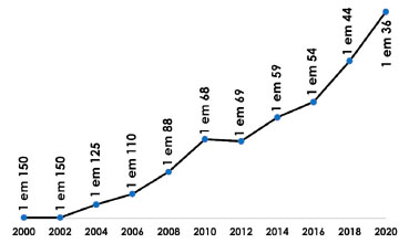 ![]() Figura 1. Número de diagnósticos de TEA em crianças norte-americanas de 2000 a 2020, com 1 em x crianças (fonte: gráfico elaborado pelas autoras com dados atualizados do CDC)13