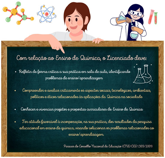OS CURRÍCULOS QUE FORMAM OS DOCENTES DE QUÍMICA OS SENSIBILIZAM QUANTO À INCLUSÃO? De acordo com o Parecer do Conselho Nacional de Educação (CNE/CES 1.303/2001),36 que trata das Diretrizes Curriculares Nacionais para os Cursos de Química, o licenciado em Química deve perceber que, atrelado à ciência, há também um papel social. Nisto o profissional formado deve ter constante interesse em se autoaperfeiçoar e, assim, garantir a busca por soluções que envolvam problemáticas coletivas e individuais, com aptidão a desenvolver recursos didáticos e instrucionais que corroborem com a construção do aprendizado. Além disso, o documento também enfatiza que a sua formação deve ter caráter humanístico, com o exercício da cidadania e com o devido respeito à vida, além de apresentar orientações específicas à atuação do licenciado no que tange ao Ensino de Química (Figura 3).