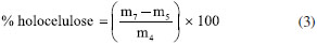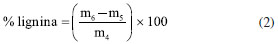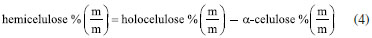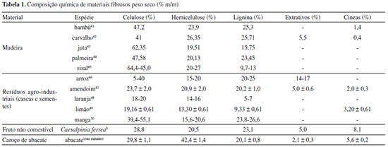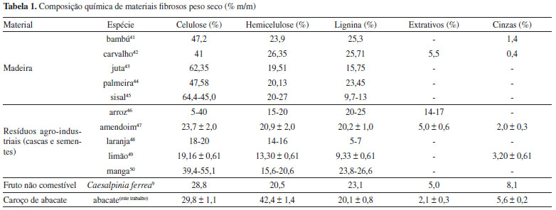 RESULTADOS E DISCUSSÃO Composição química Os procedimentos de análise da composição química da biomassa caroço de abacate foram realizados conforme procedimentos adaptados por Morais et al.37 cujos resultados preliminares foram: 2,1% de cinzas, 5,6% de extrativos com diclorometano, 29,8% de celulose, 20,1% de lignina, 53,0% de holocelulose, 10,6% de alfacelulose e 42,4% de hemicelulose. Os valores foram calculados com base em peso seco. A Tabela 1 apresenta uma comparação da composição química da biomassa caroço de abacate com outras fibras lignocelulósicas.