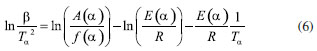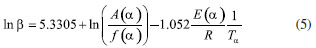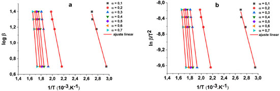 ![]() Figura 6. Determinação da energia de ativação (Eα) e do fator pré-exponencial (A) pelos modelos: (a) OFW e (b) KAS