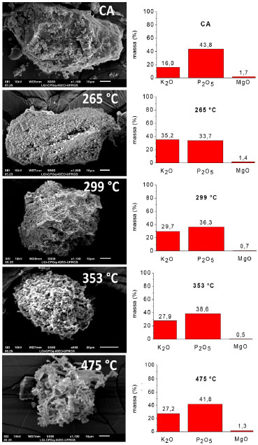 ![]() Figura 1. Microscopia eletrônica de varredura do caroço de abacate in natura e dos biocarvões obtidos por TGA bem como os respectivos teores em termos de massa percentual para K2O; P2O5 e MgO determinados por espectroscopia de energia dispersiva: (a) CA; (b) T = 265 ºC;(c) T = 299 ºC; (d) T = 353 ºC; (e) T = 475 ºC