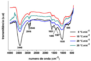![]() Figura 2. Espectros de FTIR dos biocarvões produzidos por análise de TGA nas taxas de aquecimento de 5, 15, 20 e 25 ºC min-1