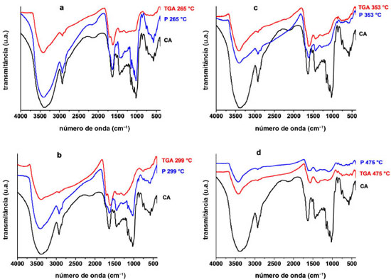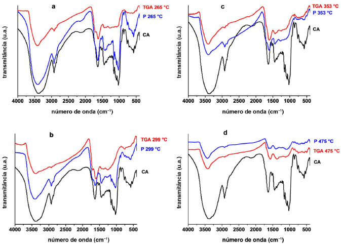 ![]() Figura 3. Espectros comparativos dos FTIR das amostras de caroço de abacate (CA) in natura e dos quatro biocarvões obtidos no TGA e na pirólise (P) em forno tubular vertical nas temperaturas de (a) 265 ºC; (b) 299 ºC; (c) 353 ºC e (d) 475 ºC