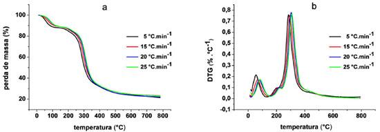 ![]() Figura 4. (a) Análise termogravimétrica do caroço de abacate em diferentes taxas de aquecimento: 5, 15, 20 e 25 ºC min-1; (b) curvas de DTG