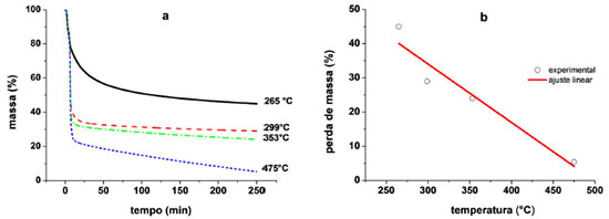 Pode ser observado nas Figuras 4(a) e 4(b) um deslocamento no sentido das temperaturas altas com o aumento da taxa de aquecimento cujo efeito é esperado devido às diferenças na transferência de calor durante o aquecimento. A perda de massa em torno de 100 °C é devido à evaporação de produtos voláteis como água e compostos de baixo peso molecular. À medida que a reação prossegue, aparecem dois picos principais, decorrentes do processo de degradação, ao redor de 200 e 300 °C. Esses picos são resultantes do alto conteúdo percentual de hemicelulose presente nas biomassas lignocelulósicas, composto que aumenta a estabilidade térmica. Sabe-se que a maior quantidade de extrativos e de umidade acelera o processo de degradação bem como da celulose que é a responsável pelo pico principal de degradação.9,70-72 Na Figura 4(b) temos as curvas de DTG para o caroço de abacate nas taxas de aquecimento estudadas em 5; 15; 20 e 25 °C min-1. Devido à complexidade estrutural das biomassas lignocelulósicas quando a degradação térmica ocorre em atmosfera inerte seguem-se inúmeras reações múltiplas que ocorrem simultaneamente. Como resultado, pode ser observada uma sobreposição dos picos de degradação com consequente pouca separação dos picos conforme mostrado na Figura 4. O modelo de degradação térmica da biomassa caroço de abacate provavelmente segue a reação de Waterloo, caminho onde os componentes sólidos são decompostos em biocarvões e compostos voláteis.73 Por esse mecanismo reacional, inicialmente, a biomassa lignocelulósica sólida se decompõe em biocarvões sólidos e compostos voláteis gasosos para, em seguida, o biocarvão sólido, se decompor em compostos voláteis gasosos.9,32,74 Apesar de serem mantidos os principais grupos funcionais constatados pelo FTIR, a estabilidade térmica diminui notavelmente com a temperatura. Há uma perda gradual de massa entre as temperaturas de 265 e 299 °C, enquanto que em temperaturas de pirólise mais altas, a diminuição é mais abrupta. Este resultado mostra uma influência evidente da pirólise nas propriedades isotérmicas. Com o objetivo de verificar o efeito da pirólise na estabilidade térmica de biocarvões obtidos em 265; 299; 353 e 475 °C e contribuir para a compreensão os tipos de estruturas formadas durante o processo de pirólise foram realizados curvas isotérmicas em um tempo total de 250 min (Figuras 5(a) e 5(b)).