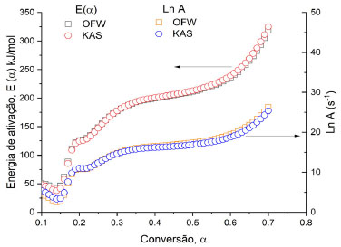 ![]() Figura 7. Variação da energia de ativação (Eα) com a conversão para os métodos OFW e KAS
