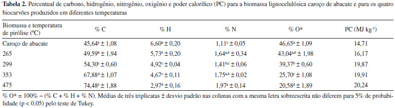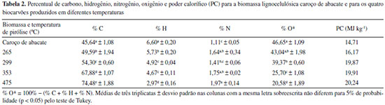 Pode ser observado que a amostra da biomassa caroço de abacate apresenta quantidades percentuais de hemicelulose consideravelmente maiores bem como de celulose e de lignina comparáveis as outras fontes de biomassas incluindo as madeiras e os resíduos agro-industriais (cascas e sementes indicando que esses parâmetros devem influenciar diretamente nas propriedades térmicas da fibra). Usualmente, uma maior quantidade de celulose na estrutura lignocelulósica permite uma maior resistência térmica devido à estrutura cristalina menos suscetível ao calor. Fibras que apresentam na sua constituição química maior quantidade de hemicelulose tendem a absorver mais umidade resultando em um aumento do platô térmico da curva de degradação térmica, por exemplo, aumentando a faixa de temperatura de aplicação. Por outro lado, uma maior quantidade de extrativos pode acelerar o processo de degradação exigindo uma menor temperatura de decomposição da biomassa. O maior teor de lignina resulta em menor flexibilidade bem como menor colapsibilidade, resultando em uma diminuição das propriedades mecânicas. Como resultado, uma rede menos compacta é formada aumentando as propriedades do material lignocelulósico.51 Análise elementar e poder calorífico Os resultados da análise elementar da biomassa caroço de abacate in natura e dos quatro biocarvões são apresentados na Tabela 2. Biomassas e biocarvões residuais ricos em carbono são materiais que usualmente apresentam uma área superficial específica variável e podem ser utilizados periodicamente na remediação de contaminantes devido ao expressivo número de substâncias polares e não-polares. Esses materiais apresentam forte afinidade por elementos inorgânicos tais como metais tóxicos e por moléculas orgânicas persistentes e/ou vestigiais presentes principalmente em ambientes aquosos, podem ser utilizados no condicionamento de solos e contribuem para reduzir as emissões de NH3 e N2O durante os processos de compostagem dependendo das condições de pirólise.52,53 Comumente, o conteúdo de carbono aumenta com o aumento da temperatura de pirólise a partir de 250 até 800 °C enquanto que o conteúdo de hidrogênio diminui.54
