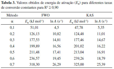 Os valores de graus de conversão, α, entre 0,1 e 0,7 foram utilizados para representar os dados. Pode ser verificado que a proximidade entre as linhas para as conversões entre 0,3 e 0,7 indica a possibilidade de um mecanismo de reação simples ou a unificação/sobreposição de múltiplos mecanismos de reação diferentes com variações da energia de ativação razoáveis em relação com a conversão. Estudos recentes demonstram que apesar da energia de ativação apresentar uma variação ligeiramente linear com o grau de conversão, o qual geralmente é determinado por um mecanismo de degradação de uma etapa, três etapas diferentes são obtidas para as fibras vegetais constituídas por celulose, hemicelulose e lignina.9 A Eα parece seguir características da celulose, enquanto a hemicelulose e a lignina afetam a ordem de reação de forma mais significativa. Também pode ser observado um distanciamento maior entre as linhas paralelas para α igual a 0,1 e 0,2 com relação às conversões mais altas que é indicativo de mudança no mecanismo reacional (Figuras 6(a) e 6(b)). Esse comportamento de afastamento do processo de degradação global foi corroborado pelos menores valores de coeficiente de determinação (R2) ao redor de 0,90 obtidos para as conversões 0,1 e 0,2 com relação às conversões mais elevadas. Na Tabela 3 são apresentados os parâmetros cinéticos de Eα e ln A determinados por cada um dos modelos isoconversionais de FWO e KAS para as variações de conversão de 0,1-0,7.