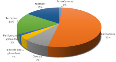 ![]() Figura 1. Distribuição por classe de metabólitos secundários das 84 substâncias isoladas no gênero Fridericia