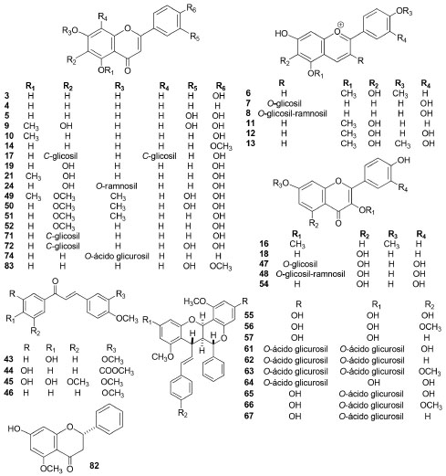 As estruturas químicas das 84 substâncias isoladas encontram-se ilustradas nas Figuras 2-7. Análise dos dados coletados permitiu concluir que 44 destes produtos naturais pertenciam à classe dos flavonoides (Figura 2), onde seis são antocianinas, dezoito são flavonas, cinco são flavonols, uma flavanona, quatro chalconas e dez biflavonoides com estrutura não usual, sendo com isso a classe de metabólitos secundários mais abundantes em Fridericia e com ampla distribuição nas plantas investigadas. Entretanto, os biflavonoides com estrutura incomum até o presente momento foram relatados nas espécies F. prancei e F. platyphylla que estão localizadas no mesmo grupamento (Acrodromous venation).36 Estes flavonoides diméricos, brachydinas A (55), B (56) e C (57), foram avaliados em relação ao seu comportamento eletroquímico e os dados mostraram que os processos de oxidação são favorecidos em pH mais alto e o transporte de massa controlado por difusão. A brachydina A oxidou-se no menor valor de potencial (0,48 V) e brachydina B e brachydina C mostraram os maiores potenciais de oxidação, 0,71 V e 0,57 V, respectivamente.43