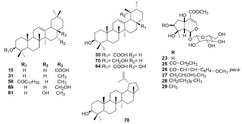 Em seguida aparecem os terpenos com quinze substâncias isoladas (Figura 3), onde nove são triterpenos pentacíclicos e seis monoterpenos da classe dos iridoides. Os iridoides aparecem restritos à F. elegans, porém esta espécie encontra-se no clado Tanaecioid, que possuem uma colocação filogenética incerta.3