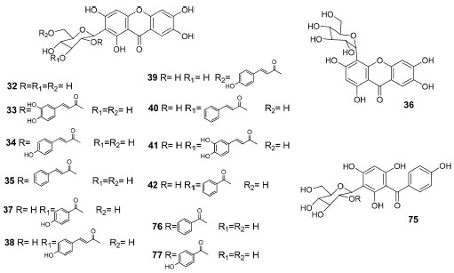 As xantonas C-glicosiladas isoladas (Figura 4) foram treze, sendo o terceiro maior grupo de metabólitos. Os dados aqui apresentados indicam que essa classe de substâncias parece estar restrita as espécies F. samydoides, F. patellifera e F. formosa e que estão localizadas no mesmo clado (Petastoma). Cabe destacar que isolou-se a mangiferina (32) com elevado rendimento 8,3%38 e 9,0%40 em relação ao extrato bruto, 32 ocorre também nas famílias Anacardiaceae (manga) e Gentianaceae.44,45 A descrição da benzofenona (75)39 em F. samydoides constitui um dado interessante, pois é um dos intermediários na biossíntese das xantonas.