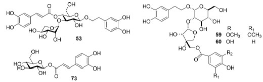![]() Figura 5. Estrutura química dos glicosídeos feniletanoides e glicosídeos fenilpropanoides isolados de espécies de Fridericia
