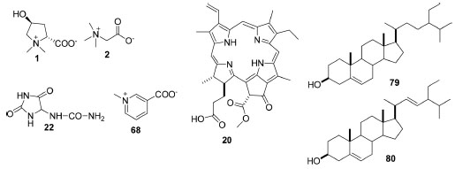 Nos dados levantados, encontrou-se também substâncias contendo nitrogênio, trans-4-hidroxiprolina betaina (1), glicina betaina (2), alantoina (22) e trigonelina (68) e os fitoesteroides (Figura 6).