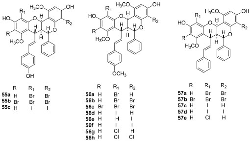 Semissíntese A halogenação direta de compostos fenólicos presentes no extrato diclorometano das raízes de F. platyphylla efetuou-se com NaBr, NaI e NaCl em meio aquoso e com o objetivo principal de obter novos derivados das substâncias: brachydina A (55), brachydina B (56) e brachydina C (57) uma vez que estas substâncias apresentaram diversas atividades biológicas, entre elas, atividade tripanocida33 e leishmanicida.102 Os autores otimizaram as condições das reações em pequena escala para a obtenção de derivados mono, di ou trihalogenados (Figura 7) e então fizeram o isolamento por HPLC-UV semipreparativo. Os derivados halogenados preparados apresentaram atividade para os parasitas: Leishmania amazonensis e Trypanosoma cruzi.103