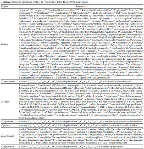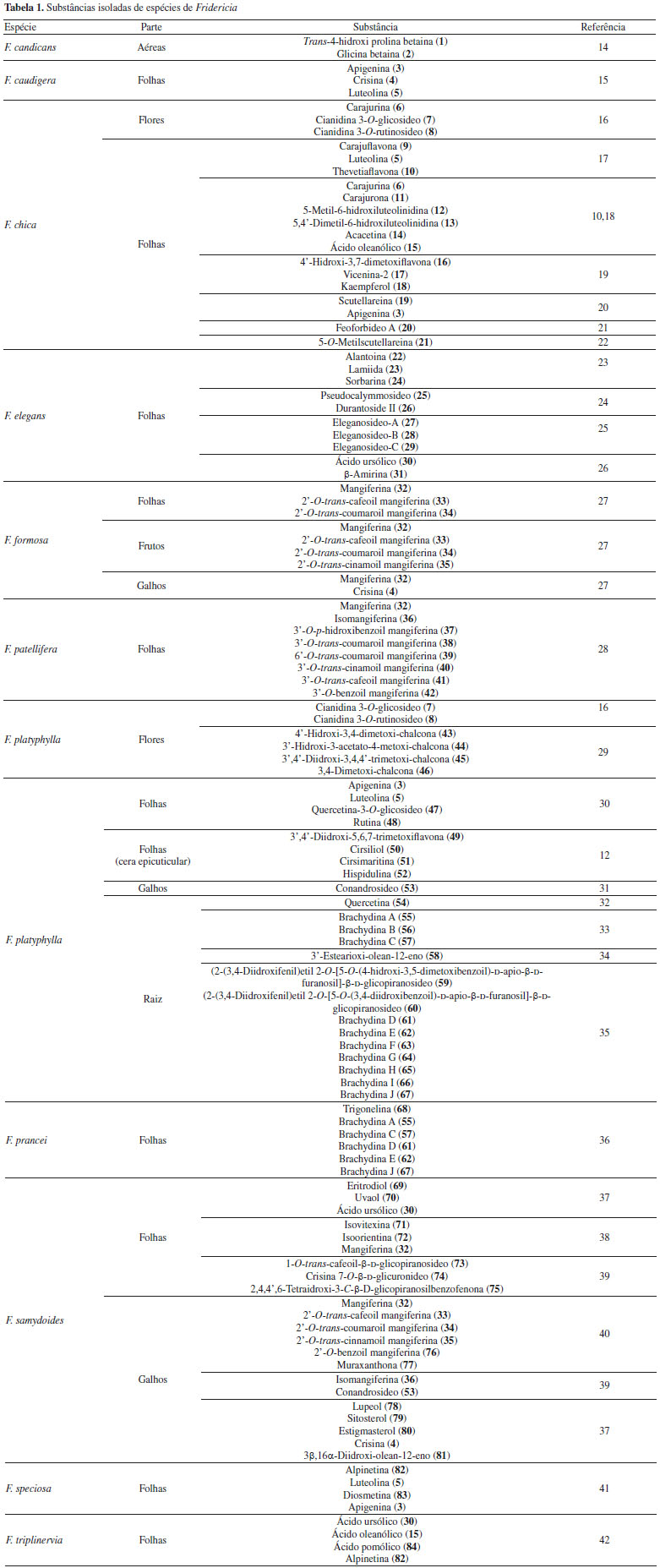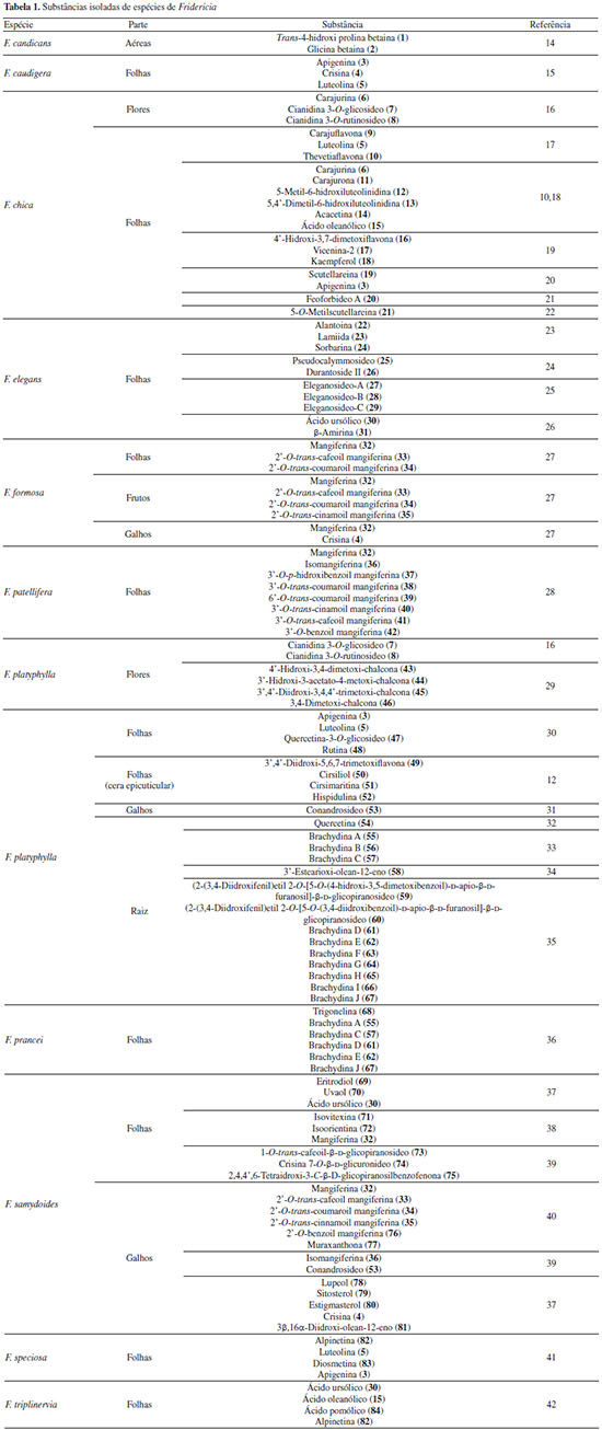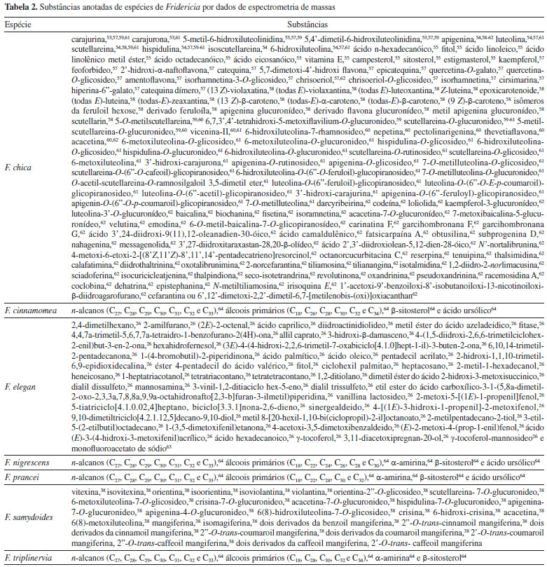 CONCLUSÕES Apenas algumas plantas do gênero Fridericia, que possui cerca de 60 espécies concentradas do México à Argentina, apresentam investigação de seus metabólitos e atividades biológicas. Com base nos dados obtidos, pode-se concluir que a maioria dos trabalhos associou o perfil químico, por meio de técnicas hifenadas, com a avaliação farmacológica, concentrando-se principalmente em F. chica, uma planta medicinal de interesse para o Sistema Único de Saúde. Isso justifica o grande interesse no estudo dessa espécie. Portanto, estudos futuros poderiam ser direcionados para outras espécies de Fridericia. Os flavonoides são metabólitos frequentes e amplamente distribuídos nas espécies estudadas do gênero e a presença de biflavonoides incomuns, juntamente com as xantonas, permitiram estabelecer um padrão de distribuição destas classes de substâncias em Fridericia corroborando com a classificação proposta.1-3