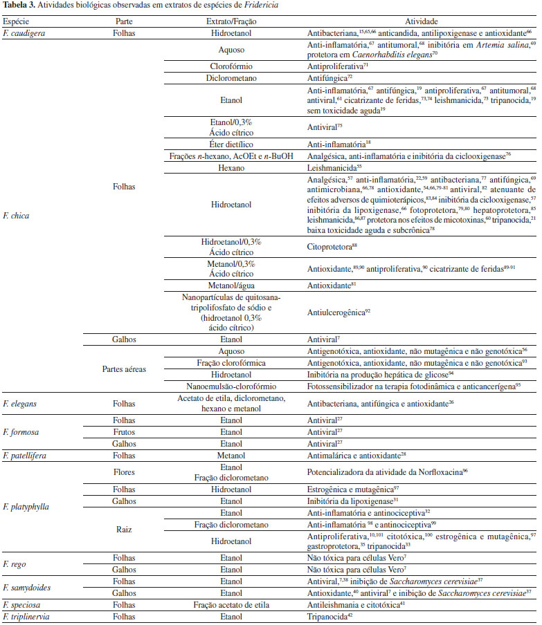 PROPRIEDADES BIOLÓGICAS A Tabela 3 detalha as atividades biológicas dos extratos de espécies de Fridericia que passaram por ensaios biológicos in vitro e em modelos animais. Estes testes incluem principalmente atividade antimicrobiana, antioxidante, tripanocida, anti-inflamatória, cicatrizante de feridas e antiviral. O maior número de estudos desta natureza foi realizado em F. chica seguida de F. platyphylla, numa clara tentativa dos grupos de pesquisa do Brasil em colaborar com o aumento das informações sobre esta planta medicinal.