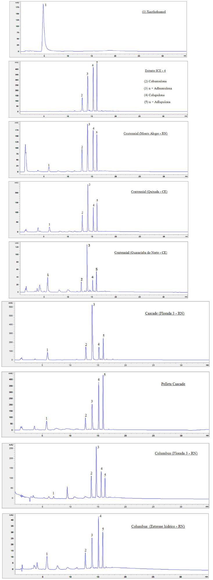 RESULTADOS E DISCUSSÃO Análise quantitativa de ácidos amargos e xanthohumol nas flores de lúpulo avaliadas utilizando cromatografia líquida (HPLC-DAD) A Figura 1 apresenta os cromatogramas obtidos para as soluções dos padrões utilizados na construção das curvas de calibração do xanthohumol e dos ácidos amargos (ICE-4), e das extrações de algumas das cultivares (em 340 nm) avaliadas e pellet comercial. É possível observar que o método cromatográfico aplicado permitiu a separação e identificação satisfatória dos compostos de interesse, considerando os comprimentos de onda avaliados. O xanthohumol (1) apresenta pico único em seu cromatograma com tempo de retenção próximo a 6 min. No padrão internacional ICE-4, os ácidos amargos - (2) cohumulona-α1, (3) n-humulona + adhumulona-α2, (4) colupulona-β1 e (5) n-lupulona + adlupulona-β2 - aparecem com picos de elevada intensidade em tempos de retenção compreendidos entre 13 e 16 min, respectivamente. Os cromatogramas evidenciam um perfil químico muito característico e similar em todas as amostras, independentemente da localidade de produção, demonstrando a presença dos ácidos amargos e do xanthohumol como constituintes majoritários nesta parte da planta e nos mesmos tempos de retenção observados para os padrões, além da presença de outras substâncias em diferentes tempos de retenção. Perfil idêntico foi verificado nas demais cultivares avaliadas neste trabalho e discutidas posteriormente.