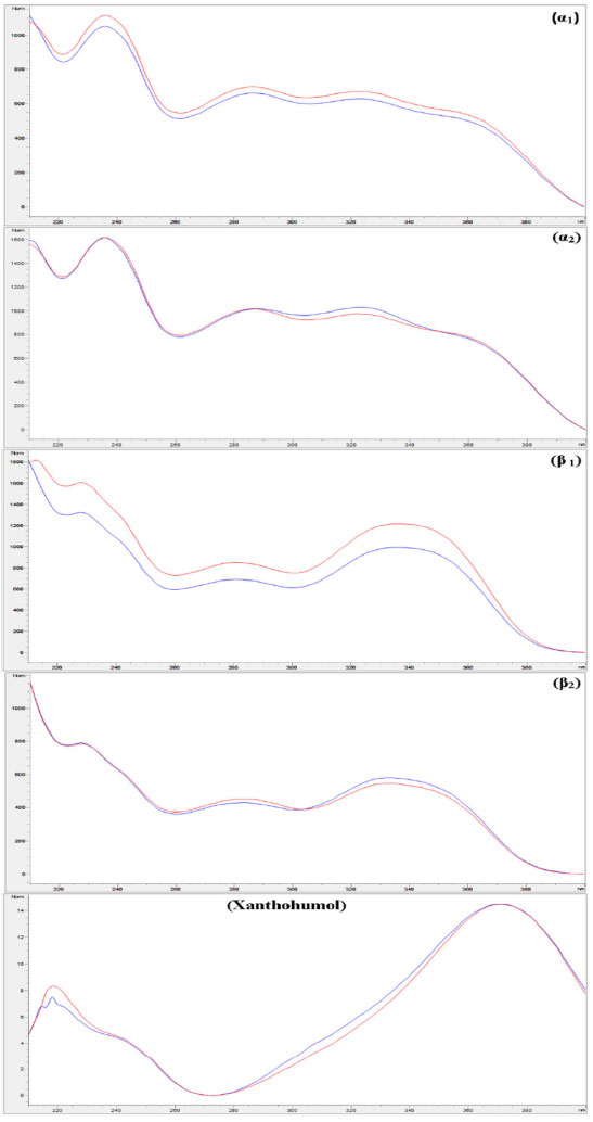 ![]() Figura 2. Sobreposição dos espectros de absorção (UV-Vis) obtidos para os picos correspondentes nos extratos de lúpulo (linha azul) com as soluções padrão cadastradas na biblioteca espectral do HPLC (linha vermelha)