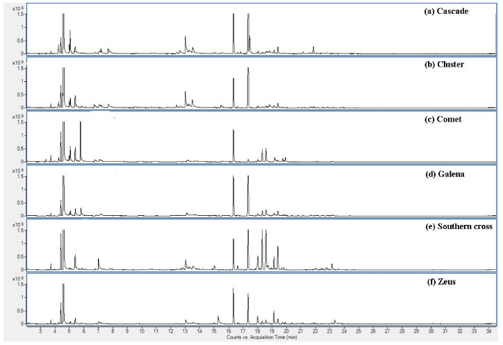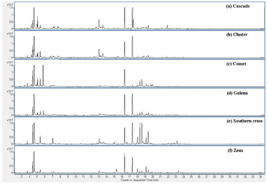 A cultivar Comet apresentou expressiva quantidade de αtotal (6,414 g 100 g-1) e βtotal (1,829 g 100 g-1), correspondendo a 69% e 60%, respectivamente, do esperado para estas substâncias numa planta já em estado de maturação.28 As cultivares Galena e Southern Cross também revelaram representativos teores de αtotal, 3,739 e 3,087 g 100 g-1, respectivamente, demonstrando serem variedades com elevado potencial de desenvolvimento nesta área, considerando os resultados obtidos para sua primeira floração. As demais cultivares (Cluster, Cascade e Zeus), apresentaram valores de αtotal entre 1,432 e 2,298 g 100 g-1 e βtotal entre 0,647 e 1,197 g 100 g-1. Curiosamente, as cultivares que apresentaram maiores valores de ácidos amargos totais (αtotal + βtotal) também foram as que possuíam maiores quantitativos de xanthohumol (Comet e Galena). A Tabela 4 também apresenta os dados quantitativos para uma amostra de pellet comercial (Citra®) contendo dois anos de estocagem e submetida às mesmas condições analíticas das flores. A embalagem indica um teor de αtotal igual a 12,4 g 100 g-1 e, para βtotal, uma faixa de 3,5 a 4,5 g 100 g-1, sendo a proporção α1/αtotal de 22 a 24%. Os resultados confirmam a ocorrência de aproximadamente 67% da concentração relatada no rótulo para os ácidos amargos, considerando o método de extração aplicado, demonstrando o efeito da estocagem na degradação dos compostos de interesse. A proporção α1/αtotal coaduna com a informação indicada no rótulo (23,9%). Ao se compararem esses resultados com a cultivar Comet de primeira floração, nota-se que ela possui 77% da composição de αtotal presente nos pellets. Isto demonstra que, devido ao fato de os pellets importados chegarem ao mercado brasileiro já com um tempo significativo de degradação dos compostos em função da estocagem, o lúpulo produzido em território nacional, devido à possibilidade de sua utilização de forma mais fresca, pode já competir com o produto importado, mesmo em plantas ainda em desenvolvimento da maturação. Análises dos óleos essenciais por cromatografia gasosa acoplada à espectrometria de massas (CG-EM) Os dados de CG-EM revelam a identificação de 33 substâncias químicas distintas nos óleos essenciais das seis diferentes cultivares avaliadas (Comet, Galena, Southern Cross, Cluster, Cascade e Zeus). Os cromatogramas (Figura 3) demonstram que o método aplicado permitiu a separação e identificação satisfatória de terpenos alifáticos, alicíclicos e diferentes compostos oxigenados, como ésteres, álcoois, cetona e epóxidos, sem a presença de compostos sulfurados. Também foi possível observar a presença de substâncias muito características dos óleos essenciais de lúpulo, como: mirceno, humuleno, cariofileno, cadinenos, limoneno, linalol e epóxidos de humuleno.1,2,25 Os dados completos de identificação e quantificação das substâncias encontradas em cada cultivar estão apresentados no material suplementar (Tabela 1S). Grande parte das substâncias identificadas é comum a todas as cultivares, porém Cluster apresentou uma variedade de substâncias de menor complexidade em seu óleo essencial, em relação às demais.