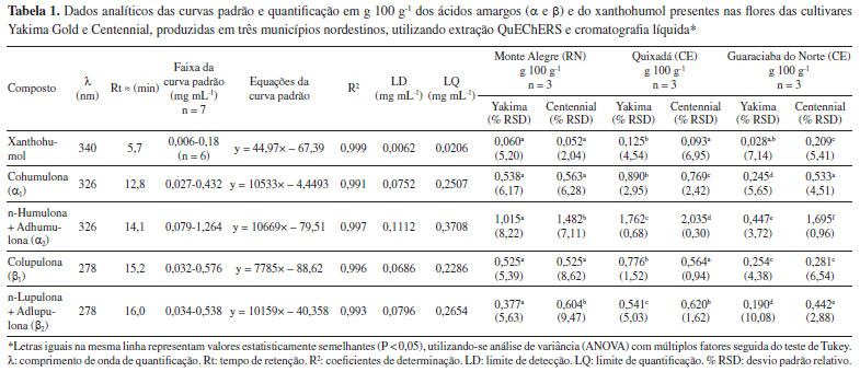 A Tabela 1 apresenta os dados analíticos e as quantificações dos ácidos amargos e do xanthohumol determinadas por HPLC-DAD nos cones das cultivares Yakima Gold e Centennial de primeira floração, em três diferentes plantações cultivadas no Rio Grande do Norte e no Ceará entre 2019-2020. As curvas padrão de calibração para os α-ácidos (324 nm), β-ácidos (278 nm) e xanthohumol (340 nm) demonstraram bons parâmetros analíticos para quantificação destas substâncias nos comprimentos de onda avaliados, considerando os valores dos coeficientes de determinação obtidos a partir das soluções padrão (R2 > 0,99) e os parâmetros LD e LQ calculados, que estão compreendidos dentro das faixas de concentração utilizadas. Os teores estão expressos sob forma de média (em g 100 g-1) das três extrações realizadas (n = 3) em todas as amostras avaliadas, com seus respectivos valores de desvio padrão relativo (% RSD) e dados estatísticos de comparação de médias entre as amostras com 95% de confiança (ANOVA/Tukey).