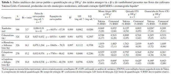 | Avaliação quantitativa de ácidos amargos, xanthohumol e óleos essenciais presentes em flores de diferentes cultivares de Humulus Lupulus L. produzidas na região nordeste do Brasil Quantitative evaluation of bitter acids, xanthohumol and essential oils present in flowers of different cultivars of Humulus lupulus L. grown in northeastern Brazil |