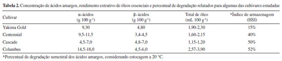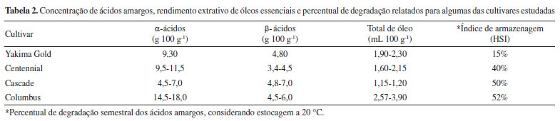 A Tabela 2 apresenta as faixas de concentração dos ácidos amargos, rendimento extrativo dos óleos essenciais e os índices de armazenagem (HSI), de algumas das cultivares analisadas neste trabalho. Os dados foram utilizados como referência para discussão dos resultados e obtidos no portifólio-analítico disponível no site do grupo Barth Haas® e no software de elaboração de receitas cervejeiras BeerSmith3® (versão 3.2.7).27