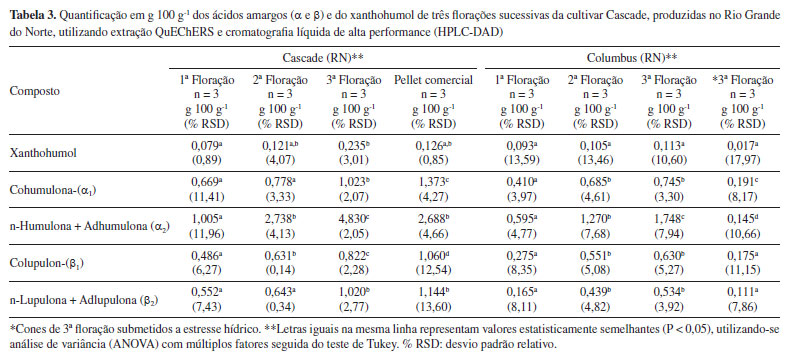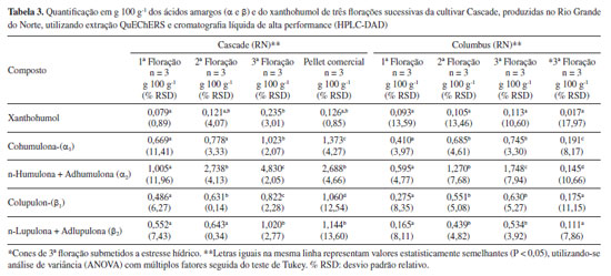 Conforme indicado na Tabela 2, as variedades Yakima Gold e Centennial apresentam teores de α-ácidos totais (αtotal = α1 + α2) entre 9,3 e 11,5 g 100 g-1, e para β-ácidos totais (βtotal = β1 + β2), entre 3,4 e 4,8 g 100 g-1, sendo consideradas variedades de amargor de moderado a alto. Conforme demonstrado na Figura 1, foi possível realizar a quantificação dos ácidos amargos e do xanthohumol em todas as amostras analisadas. Os α-ácidos se formaram em maior quantitativo do que os β-ácidos e a cultivar Centennial foi a que apresentou os maiores valores de αtotal, independentemente da plantação de origem. Os teores de αtotal para Yakima Gold variaram de 0,692 a 2,652 g 100 g-1 e a amostra oriunda do cultivo em Quixadá teve maior quantitativo entre todas as plantações. Nesta, os valores de αtotal representaram 28% do valor de referência, já em sua primeira floração; porém, a proporção α1/αtotal se mostrou levemente acima do esperado para esta variedade.28 A cultivar Centennial apresentou valores de αtotal entre 2,045 e 2,804 g 100 g-1, sendo os resultados das diferentes plantações, estatisticamente semelhantes para maioria das substâncias e inferiores ao mínimo esperado para esta cultivar. A proporção α1/αtotal se mostrou muito similar entre todas as plantações (24-27%), estando dentro do esperado para esta variedade.28 Os teores de xanthohumol variaram de 0,028 a 0,209 g 100 g-1, sendo o resultado mais expressivo obtido para a cultivar Centennial oriunda do município de Guaraciaba do Norte (CE). Apesar dos ácidos amargos totais entre as amostras, não apresentarem no geral, diferença estatística significativa nas concentrações, o cultivo com adubação exclusivamente orgânica na serra da Ibiapaba (CE), segundo o produtor, propiciou aumento de aproximadamente 10% na produtividade dos cones de ambas as variedades em relação as demais plantações. Os dados de desvio padrão relativo (% RSD) variaram de 0,3 a 10,08, indicando boa precisão analítica nas extrações realizadas em triplicata, para as análises de cada cultivar. Desta forma, os resultados apontam que, em sua primeira floração, as plantas cultivadas nos estados do Rio Grande do Norte e do Ceará se mostraram em processo de adaptação às regiões de plantio já que as quantidades de ácidos amargos foram inferiores ao mínimo esperado para todas as cultivares. Dados da literatura apontam que os teores de ácidos amargos nas flores de lúpulo tendem a aumentar durante os três anos de idade da planta, mantendo-se estáveis por até 20 anos, desde que fornecidas as condições adequadas de cultivo.29 Ressalta-se que a baixa quantidade de ácidos amargos e dos óleos essenciais encontrados nos primeiros anos de cultivo é esperada, conforme dados da literatura, sendo o lúpulo denominado tecnicamente em língua inglesa por "baby hop".30,31 Em publicação recente, Leles et al. 32 demostraram resultados significativos de α-ácidos já na primeira floração, utilizando espectrofotometria para quantificação e o cultivo das plantas com suplementação luminosa no estado do Paraná. A Tabela 3 apresenta os resultados para quantificação de ácidos amargos e xanthohumol (g 100 g-1) das cultivares Cascade e Columbus, produzidas no Rio Grande do Norte, ao longo de três floradas consecutivas, do estresse hídrico e de pellet comercial (Cascade), com dois anos de estocagem (safra 2021).